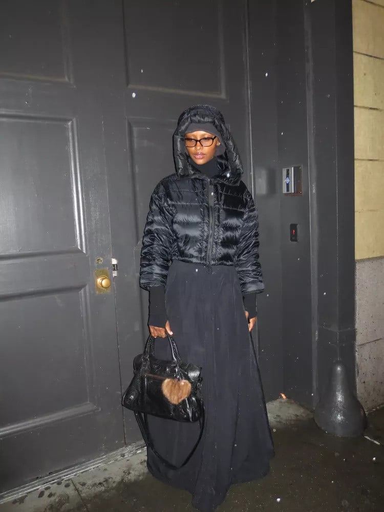 Layering is key for winter outfits, but don’t be afraid to experiment with unexpected combinations. Alyah Chanelle Scott pairs a pastel quilted vest with a cozy sweater and a boho maxi skirt, then adds some of the season’s buzziest accessories for a playful yet practical look.
