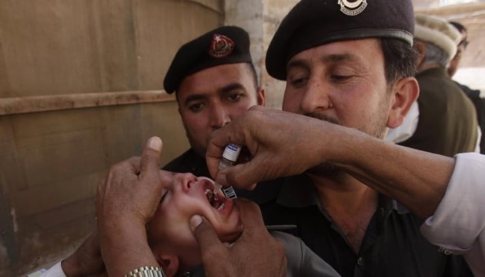 Health workers give polio vaccine drops to a child as police stand guard during a vaccination campaign in Peshawar, Khyber Pakhtunkhwa. — Reuters/File
