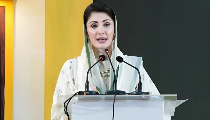 Punjab Chief Minister Maryam Nawaz addresses the ceremony for “Apni Chhat Apna Ghar” scheme on August 6, 2025. — Screengrab via Geo News