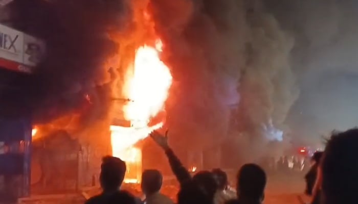 Flames engulf Gul Plaza situated at Karachi’s MA Jinnah Road, January 17, 2026. — Geo News