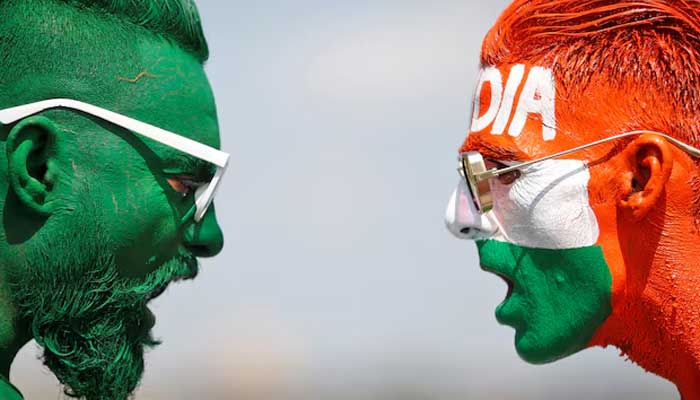 Cricket fans, with their faces painted in the Pakistans and Indias flag colours, pose for a picture ahead of the first match between Pakistan and India. — Reuters/File