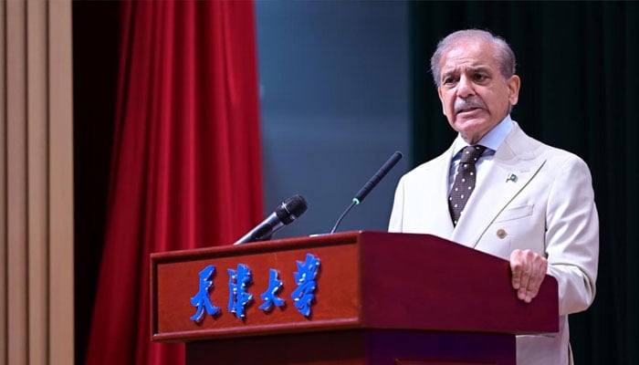 Prime Minister Shehbaz Sharif addresses students and faculty members of Tianjin University in China, August 31, 2025. — PID