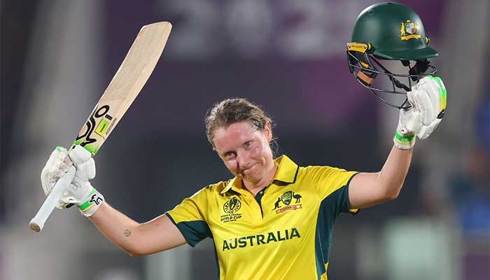 Australia skipper Alyssa Healy celebrates after completing century during the ICC Womens Cricket World Cup match against India at the Dr Y S Rajasekhara Reddy ACA-VDCA Cricket Stadium in Visakhapatnam on October 12, 2025. — Facebook/@cricketworldcup