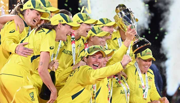 Australian players celebrate with trophy after winning the Women’s World Cup. — ICC website