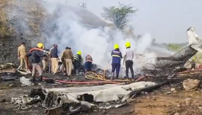 Flames can be seen after a plane carrying Ajit Pawar and others crashed on January 28, 2026. — X@PTI_News
