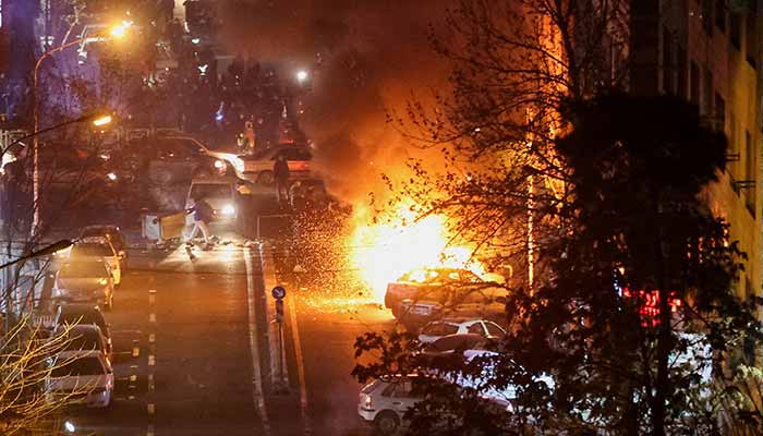 Cars burn in a street during a protest over the collapse of the currencys value, in Tehran, Iran, January 8, 2026. — Reuters