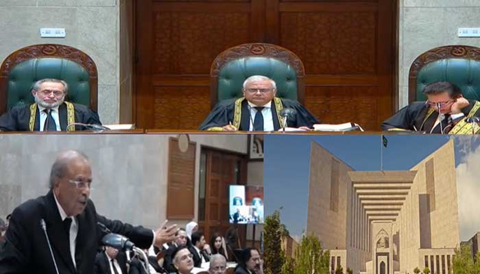 The case, live-streamed on the SC YouTube channel, was heard by an eight-member constitutional bench led by Justice Amin-ud-Din Khan, which also includes Justice Jamal Khan Mandokhail, Justice Muhammad Ali Mazhar, Justice Ayesha A Malik, Justice Syed Hasan Azhar Rizvi, Justice Naeem Akhter Afghan and Justice Shahid Bilal Hassan.