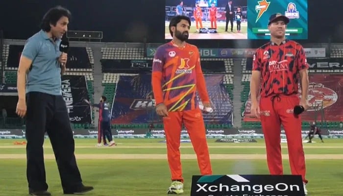 RawalPindiz captain Mohammad Rizwan (centre) and Karachi Kings David Warner at the toss for their PSL 11 match at the Gaddafi Stadium in Lahore on April 2, 2026. — Screengrab via Livestream