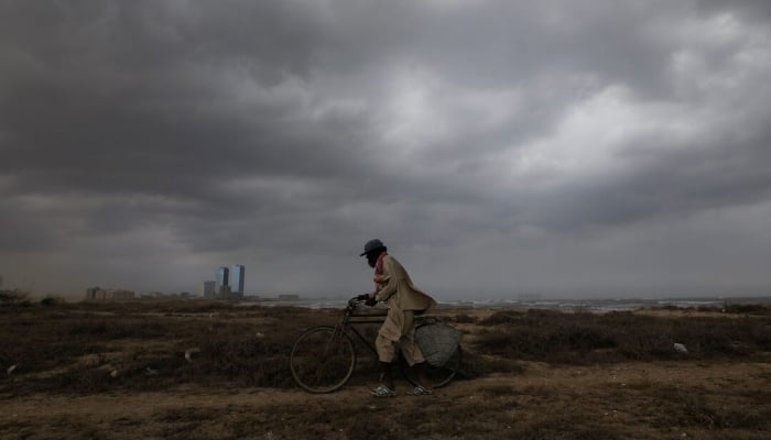 A fisherman walks with his bicycle with rain clouds in the background, before the arrival of cyclonic storm Biparjoy, over the Arabian Sea, in Karachi, June 15, 2023. — Reuters