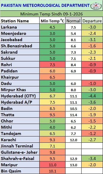 Jacobabad, Sukkur, Dadu, Sakrand, and Mirpur Khas recorded minimum temperatures around 5.0°C, while Hyderabad city recorded 6.7°C.