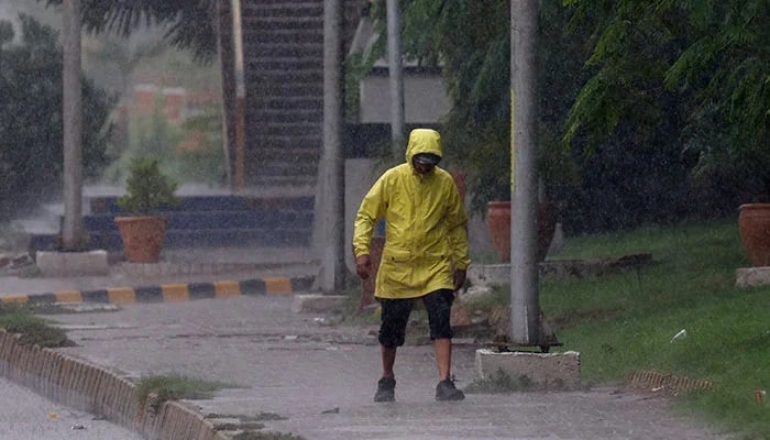 A man wears a rain jacket as he walks along a sidewalk during a rain in Karachi, Pakistan, August 2, 2024. — Reuters