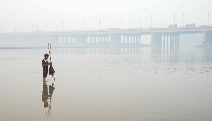 Faheem sets up a fishing trap, with the bridge over the River Ravi in the background, amid smog in Lahore, Pakistan, November 5, 2024. — Reuters