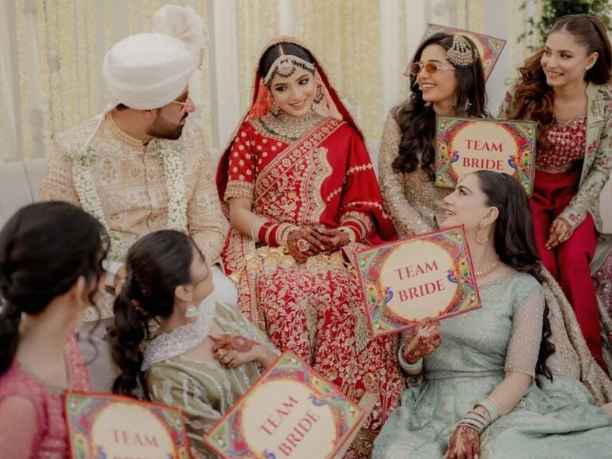 On Tuesday, Khan shared visuals from her baraat ceremony, which took place in Karachi. She was seen wearing a red bridal lehenga embellished with gold tilla and dabka work, paired with traditional jewellery. The overall bridal look reflected a South Asian bridal style.
