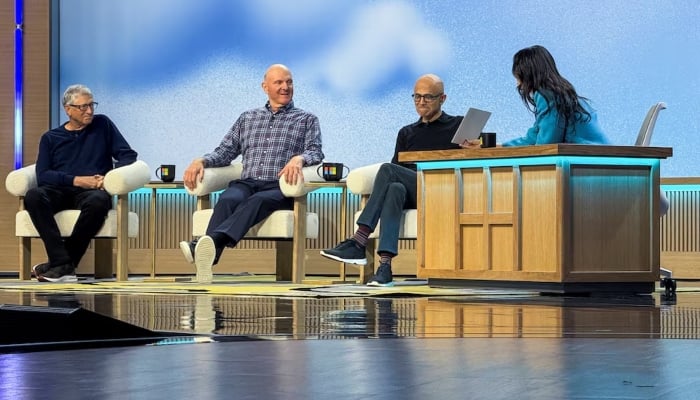 (From left to right) Microsoft co-founder Bill Gates, former Microsoft CEO Steve Ballmer, and CEO of Microsoft Satya Nadella make a joint public appearance at the Microsofts 50th anniversary celebration in Redmond, Washington, US, on April 4, 2025. — Reuters