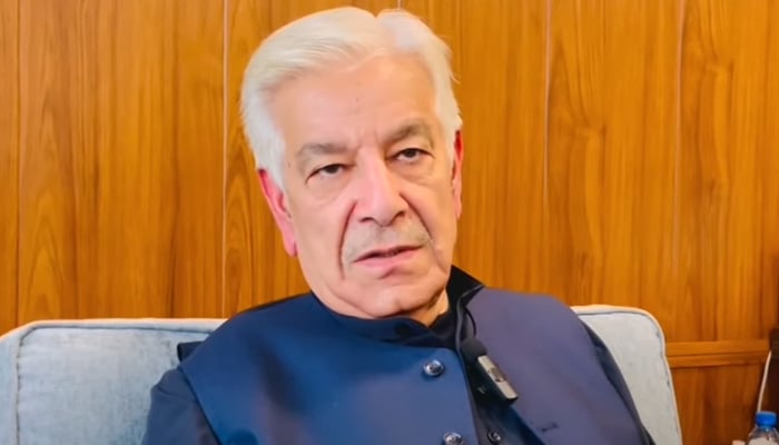 Defence Minister Khawaja Asif speaks during an interview. — Screengrab via Geo News