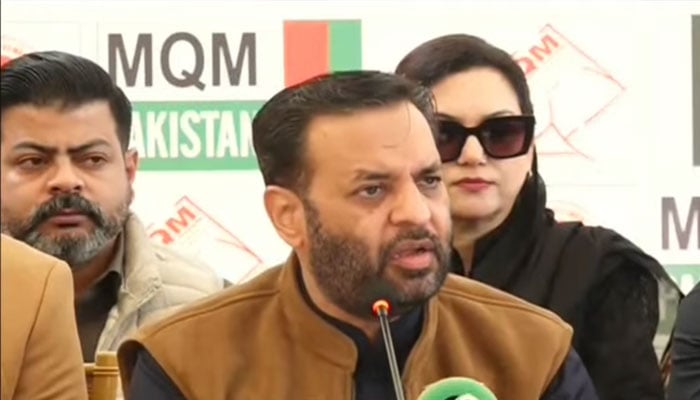 MQM-P leader and Federal Minister for Health Syed Mustafa Kamal is addressing a press conference in Karachi on December 28, 2025. — Screengrab via Geo News