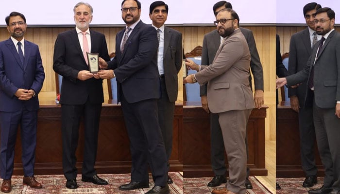 National Accountability Bureau (NAB) Chairman retired Lt-Gen Nazir Ahmed distributing shields to the B4U scam case team at cheque distribution ceremony of B4U scam at NAB headquarters on August 21, 2025.