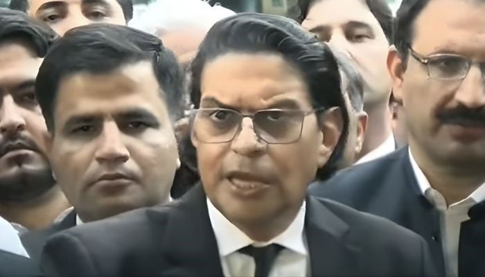 Pakistan Tehreek-e-Insaf (PTI) Secretary General Salman Akram Raja talks to journalists outside Peshawar High Court on October 13, 2025. — YouTube/Geo News/screengrab