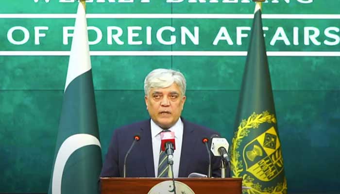 Foreign Office spokesperson Shafqat Ali Khan addresses the weekly press briefing on October 17, 2025. — Screengrab via Geo News