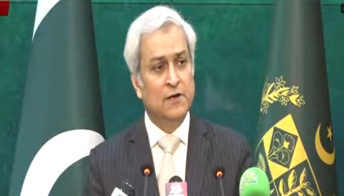 Foreign Office Spokesperson Tahir Andrabi is speaking at a weekly press briefing in Islamabad on November 7, 2025. — Screengrab via Geo News
