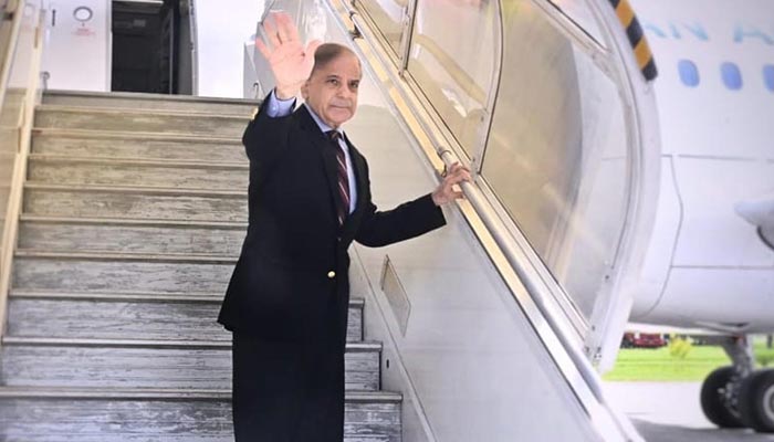 PM Shehbaz is accompanied by Defence Minister Khawaja Asif, Information Minister Attaullah Tarar, and Special Assistant to the PM Tariq Fatemi.