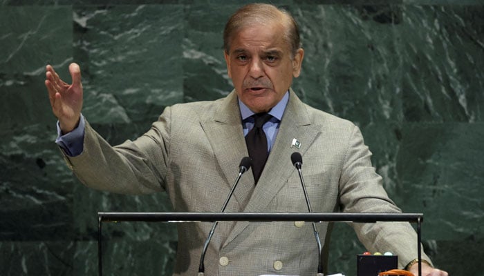 PM Shehbaz’s wide-ranging address centered on the conflict in Gaza, the Kashmir dispute with India, climate change, and global economic issues.