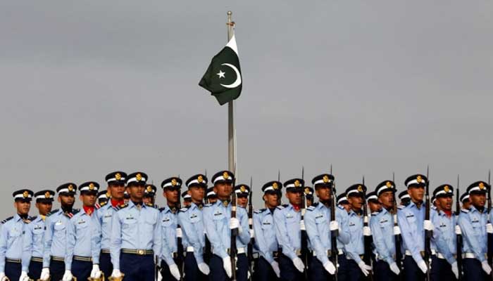 Members of the Pakistan Air Force march near the mausoleum of Muhammad Ali Jinnah during Defence Day ceremonies, or Pakistans Memorial Day, to express solidarity with the people of Kashmir, in Karachi. — Reuters