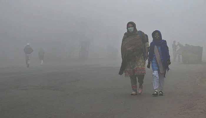 0 A student walks with her mother to school amid foggy weather in Lahore on December 21, 2022. — AFP