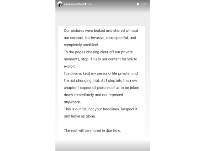 Ramsha, in her statement, said that her and Khushhals’s images were shared without their consent, demanding that media pages stop circulating private moments for personal gain. “To the pages chasing clout off our private moments, stop. This is not content for you to exploit,” she wrote.