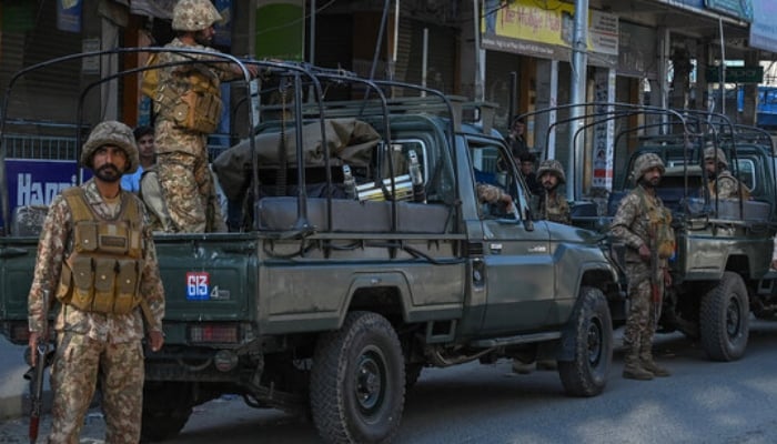 Pakistan Army troops stand guard along a street in Kabal town of Swat Valley in Khyber Pakhtunkhwa. AFP/File