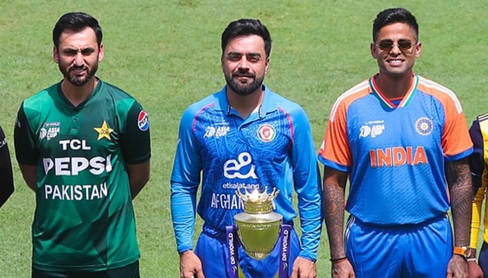 (Left to right) Pakistan skipper Salman Ali Agha, Afghanistan’s Rashid Khan, and India’s Suryakumar Yadav poses photo with trophy ahead of the commencement of the ACC Men’s T20 Asia Cup 2025, September 9, 2025. — Facebook/@AsianCricketCouncil
