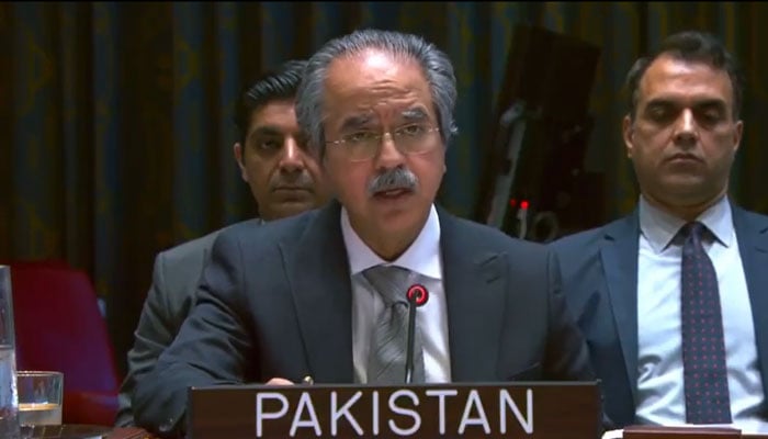 Pakistan’s Permanent Representative to the UN Ambassador Asim Iftikhar Ahmad speaks to UNSC on September 17, 2025. — X@PakistanUN_NY