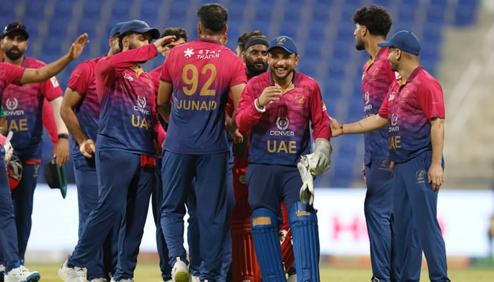 UAE players celebrates a wicket during the ACC Mens Asia T20 Cup 2025 match against Oman at the Zayed Cricket Stadium in Abu Dhabi on September 15, 2025. — AFP