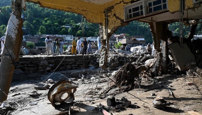 People gather near the remains of a damaged house at the flood-affected Buner district in KP on August 19, 2025. — AFP