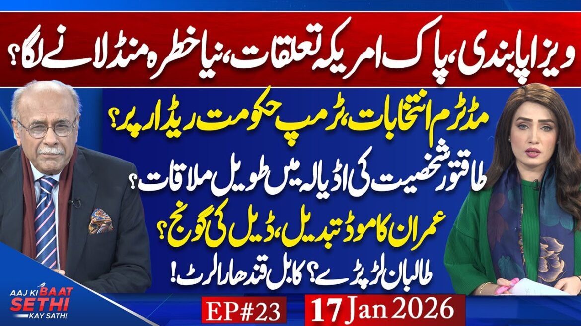 In this episode of Aaj Ki Baat – Sethi Kay Sath, anchorperson Syeda Ayesha Naaz and senior analyst Najam Sethi discuss major national and international developments, including Trump’s decision to suspend immigrant visas for 75 countries and who will be affected, the appointment of Mehmood Khan Achakzai as Opposition Leader, and who is meeting Imran Khan in Adiala Jail along with his latest statement from prison, while also analyzing rising security challenges involving TLP, BLA, internal divisions within the Taliban, and the escalating Pakistan–Afghanistan tensions shaping the region.