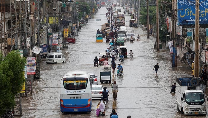 Vehicles move along a flooded street following monsoon rains and rising water levels in Sialkot, August 27, 2025. — Reuters