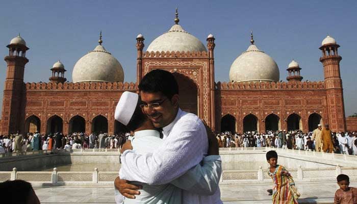 An undated image of people hugging each other after Eid prayers. —APP/File