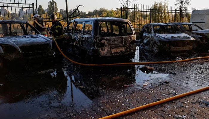 Firefighters work near damaged vehicles at the site of a residential building damaged during a Russian drone and missile strike, amid Russias attack on Ukraine, in the outskirts of Kyiv, Ukraine, September 20, 2025. — Reuters